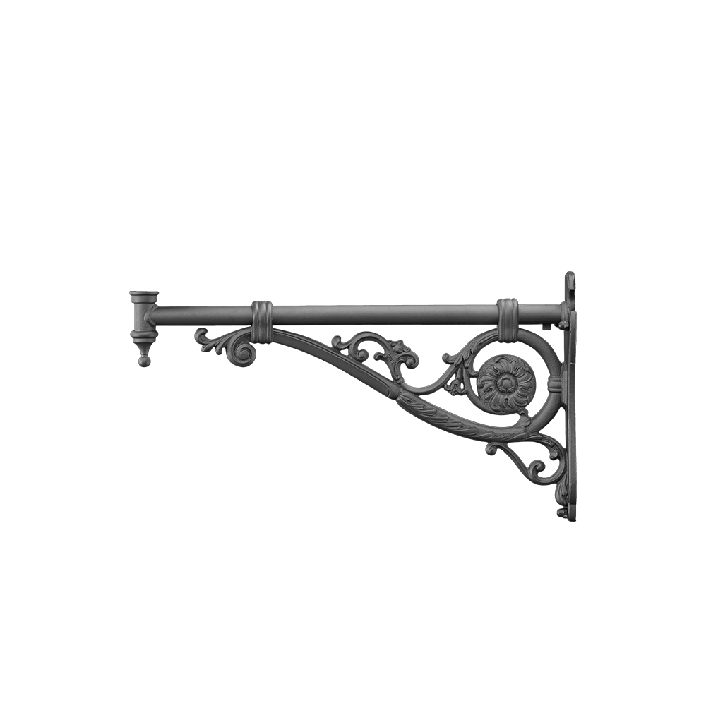 Wandarm aus Gusseisen mit Trägerrohr aus feuerverzinktem Stahl, ausgestattet mit einem 3/4" GAS-Anschluss für die Montage der Leuchte, interner Kabelführung und Erdungsklemme. Wandbefestigung mit Spreizdübeln.