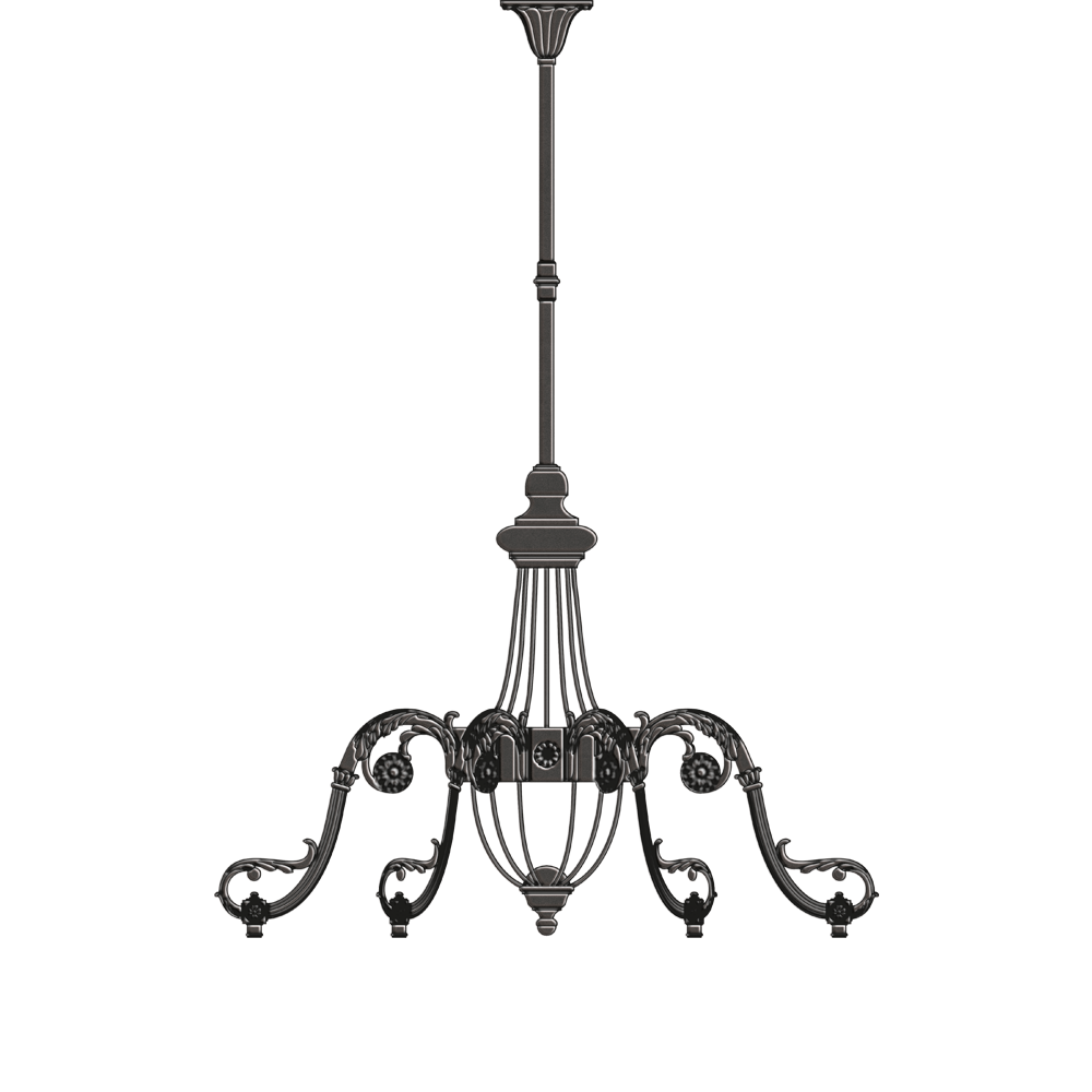 Sechsflammiger Kronleuchter aus Aluminium, feuerverzinktem Stahl und Messing, bestehend aus einem Baldachin, einem Tragrohr, einem zentralen Träger und sechs Armen, die mit Blättern, Messingrosetten und weiteren dekorativen Elementen verziert sind. Arme mit Gewindeanschluss zur Montage von Pendelleuchten.