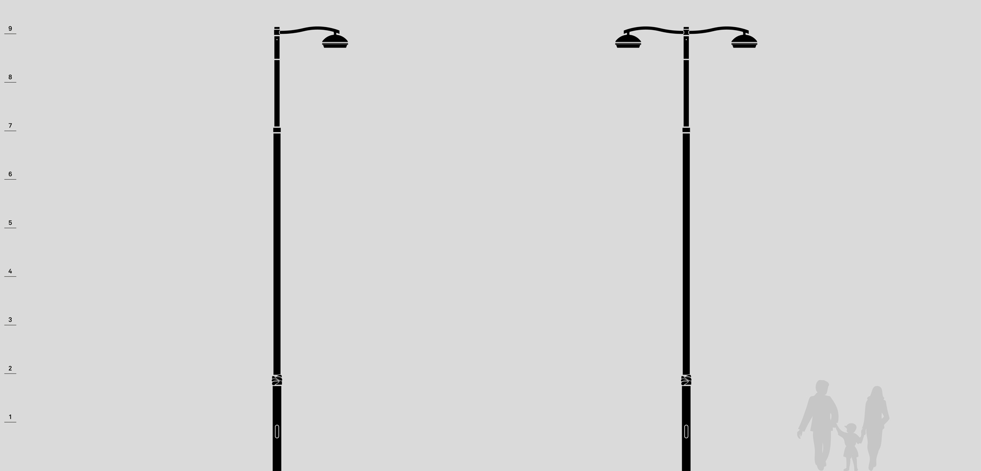 Die Kollektion umfasst zwei Straßenlaternen: eine mit einfachem Ausleger und eine mit doppeltem Ausleger, montiert auf Masten mit Höhen von 7, 8 und 9 Metern. Die Leuchte der Propus-Kollektion ist das Modell Light 34.