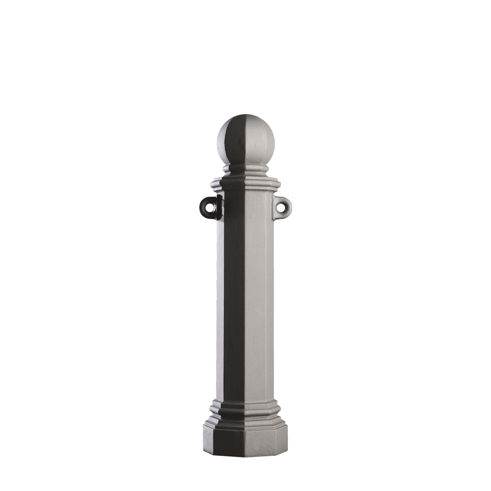 Poller aus Sphäroguss gefertigt; achteckiger Sockel und Körper, gekrönt von einer Kugel mit acht Segmenten, mit Ringen zur optionalen Kettenbefestigung.
