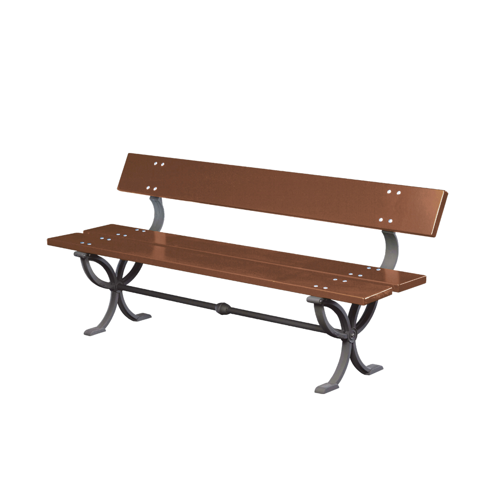 Bank bestehend aus Stützen aus Gusseisen, mit zentraler Verbindungsstange aus Stahlrohr; Rückenlehne und Sitzfläche gefertigt aus Iroko Braunholz.
