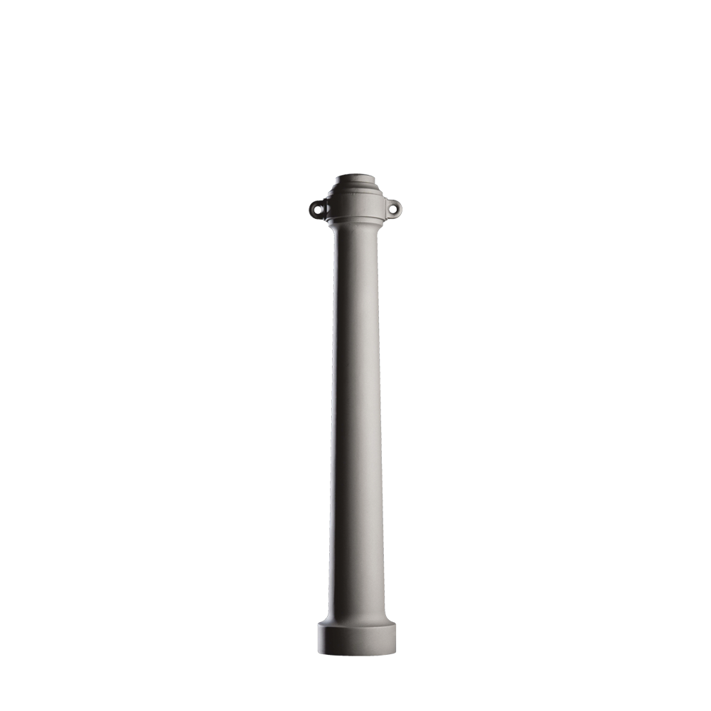 Poller aus Sphäroguss gefertigt; zylindrischer Sockel, trichterförmiger Körper und oberer Teil mit Ringen zur optionalen Kettenbefestigung.