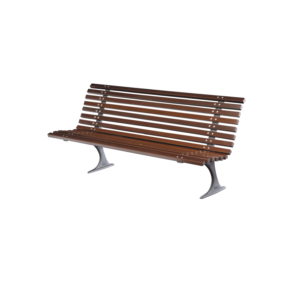 Bank bestehend aus Trägern aus Gusseisen mit Kugelgraphit, wobei die Sitzfläche und Rückenlehne aus braunem Irokoholz gefertigt sind.
