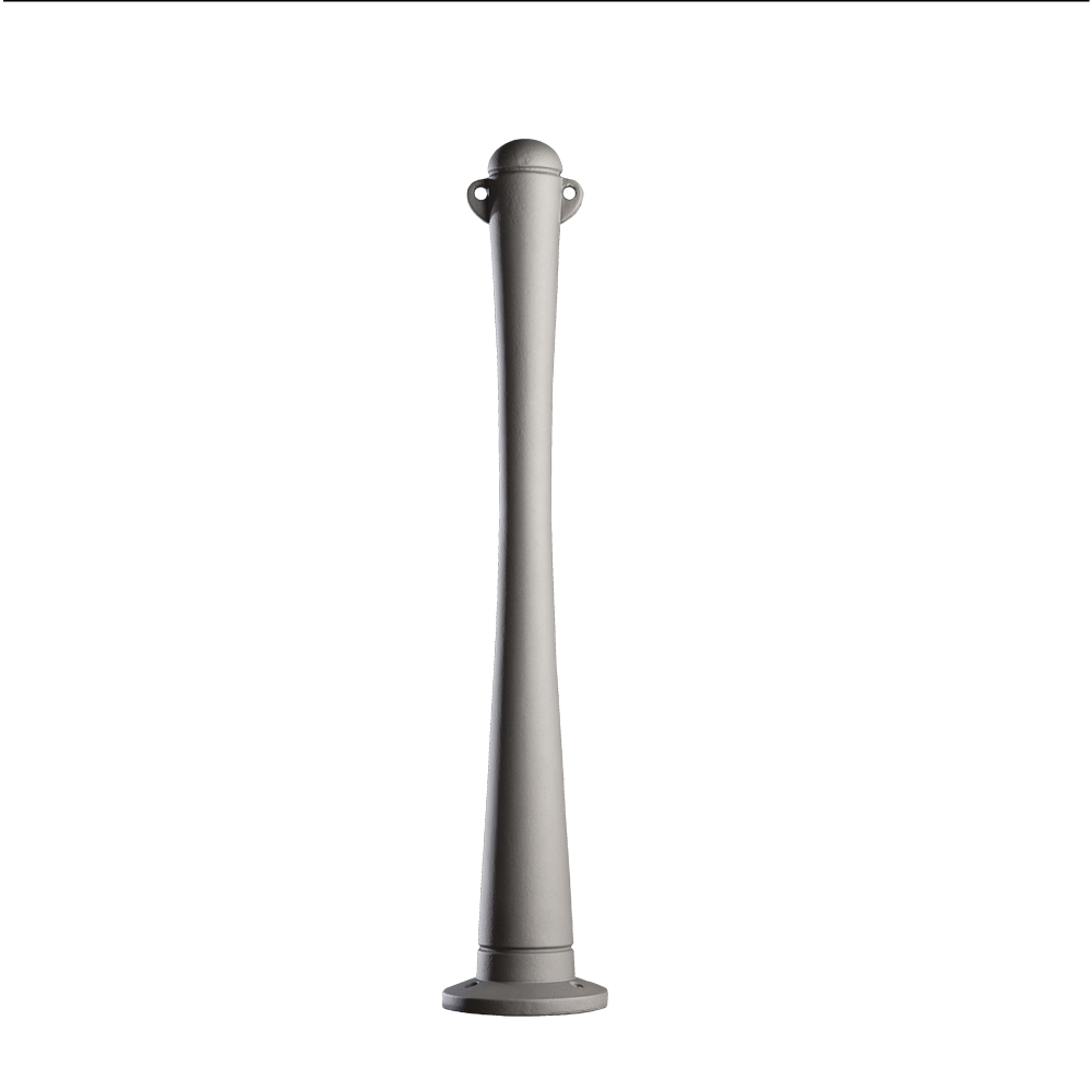 Bollard made of spheroidal graphite cast iron; cylindrical base and double-cone shaped body, with rings at the top for optional chain attachment, topped with a hemispherical cap.