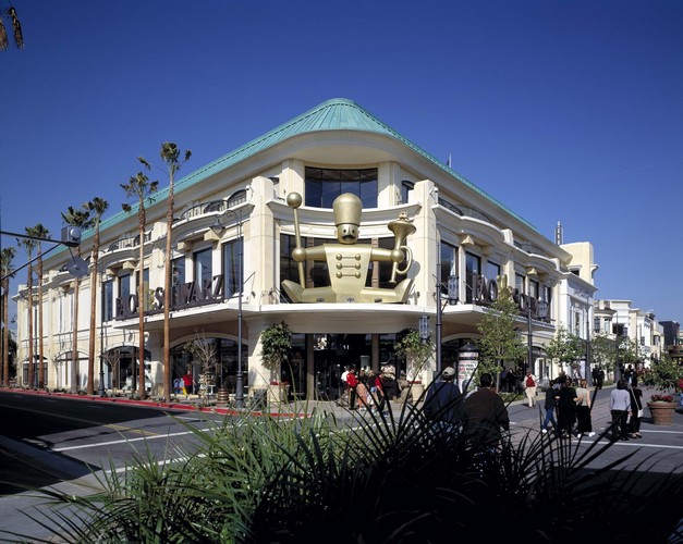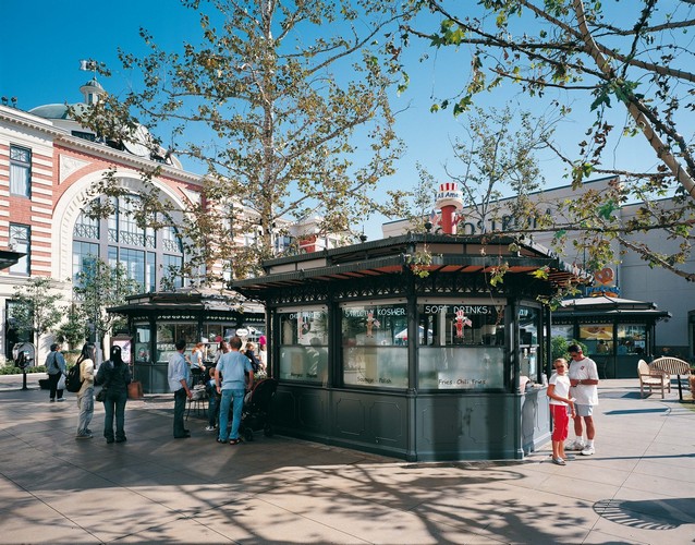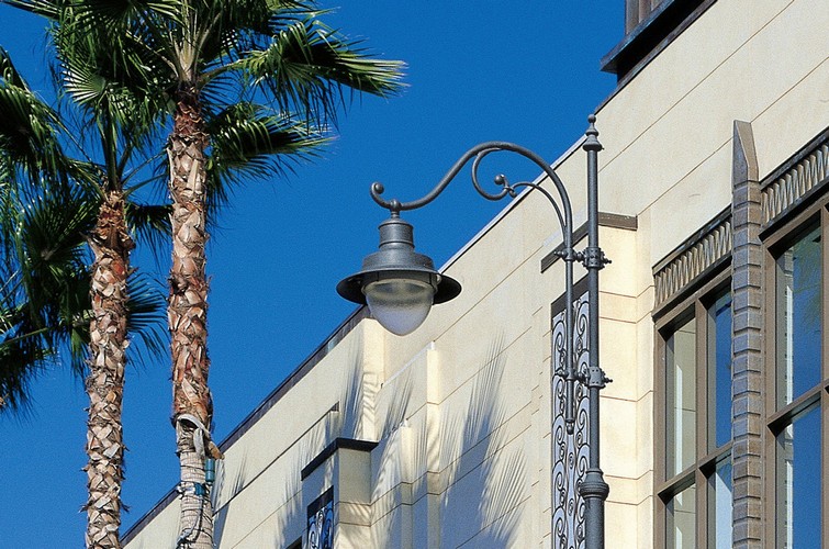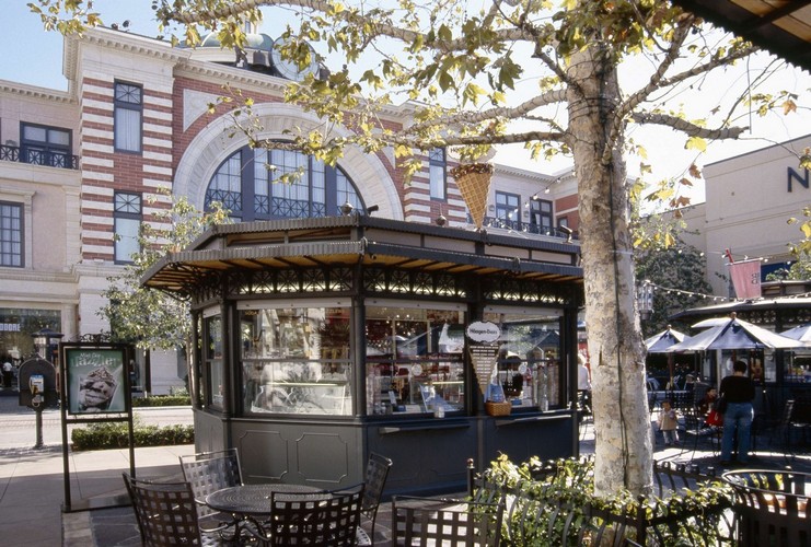 The Grove is in the western zone of Los Angeles. A centre for shopping, it also offers restaurants and entertainment, and is one of the most frequented parts of the city. Around the central fountain, the principal elements of décor are four great Neri kiosks.