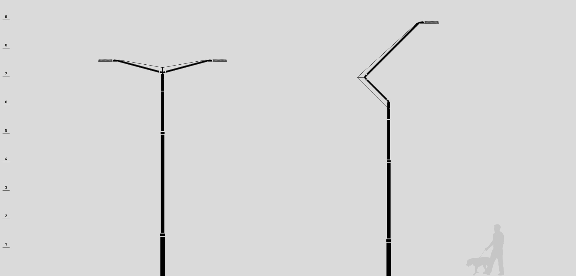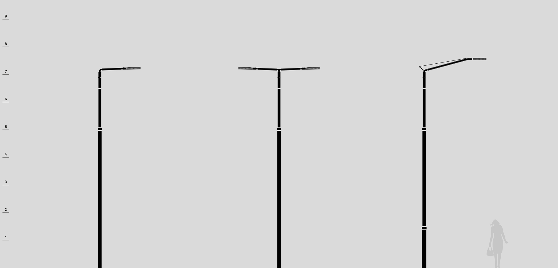 La colección está compuesta por farolas de uno y dos brazos, versiones suspendidas y tensadas para las luminarias, y una larga lista de elementos de mobiliario urbano: bolardos, ceniceros, papeleras, bancos y marquesinas.