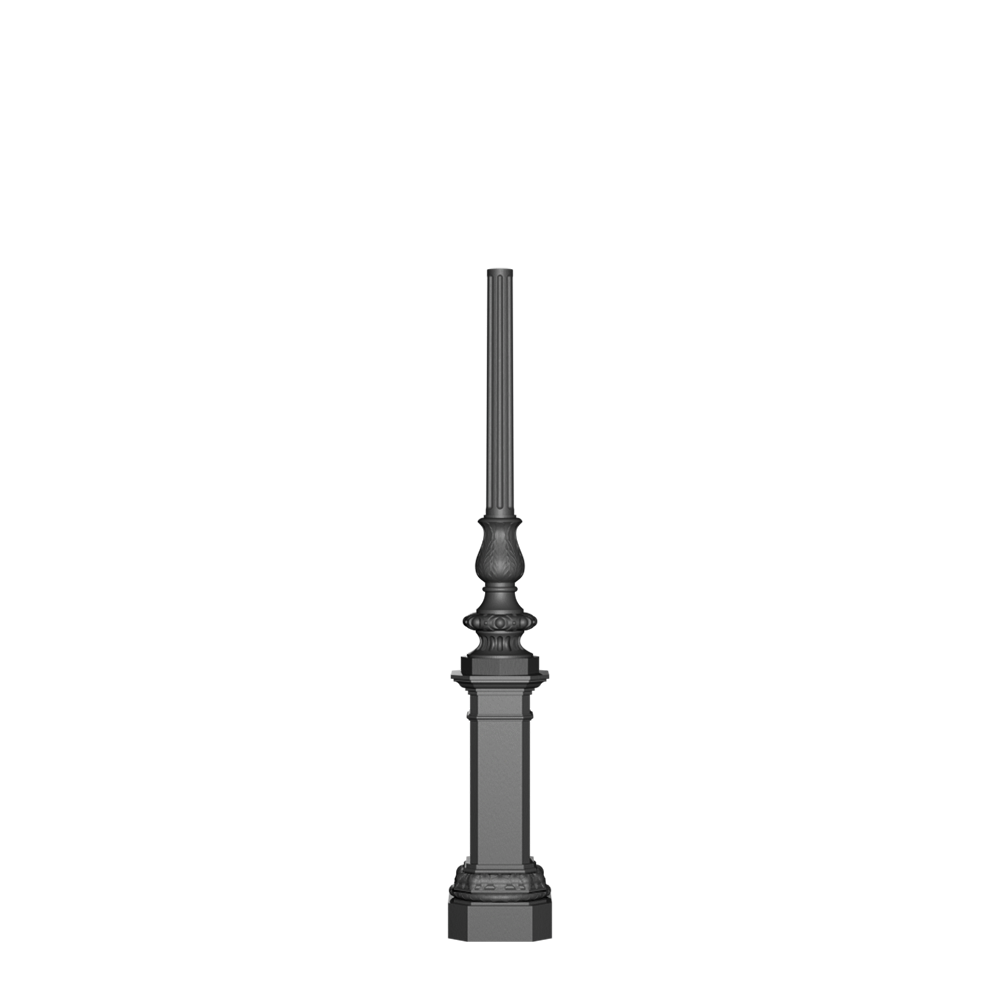 Poste modular de fundición de hierro con base cuadrada con esquinas achaflanadas, decorado con hojas florales, provisto de puerta de inspección. Columna superior decorada con hojas. Núcleo interior de acero galvanizado en caliente.