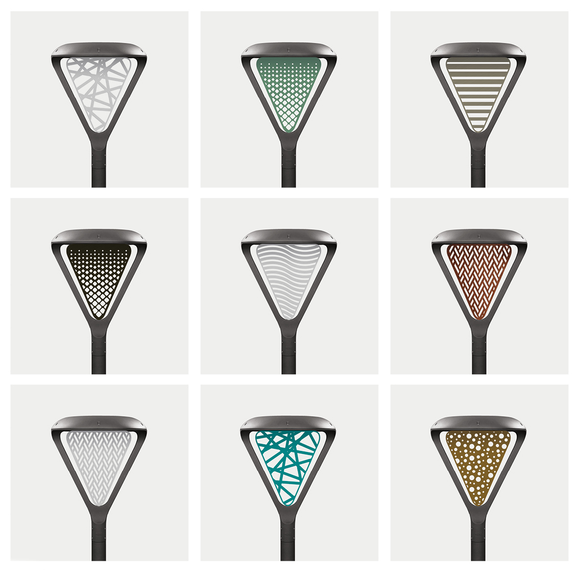 El blade es un filtro colocado dentro del soporte en forma de "V", una pantalla de aluminio anodizado que puede personalizarse tanto en color como mediante corte láser. Este elemento técnico y estético ofrece a los diseñadores una herramienta adicional. Desde un escudo municipal, pasando por colores distintos como señalización integrada, hasta un patrón que proyecta interesantes juegos de luz y sombra: las posibilidades son infinitas.