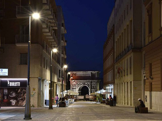Brindisi, ciudad antigua y uno de los puertos naturales más grandes del Mediterráneo, siempre ha sido conocida como un punto de encuentro entre la historia y la modernidad. Hoy, gracias a un ambicioso proyecto de City Green Light, su encanto brilla con una nueva luz. Los históricos faroles Neri de 1850, montados sobre columnas y soportes de fundición, han sido actualizados con tecnología LED, mientras que se han instalado 350 unidades de Light 100 en los callejones más estrechos. El corazón de la ciudad, desde la Plaza de la Catedral hasta las avenidas que conducen al puerto, ha cobrado un nuevo aspecto, transformándose en un elegante salón al aire libre.