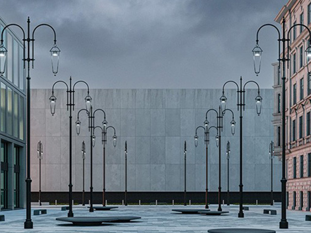 Hay 12 postes con dos brazos, fundidos por la Fundición Pignone en 1932, que han sido restaurados y devueltos como nuevos para amueblar e iluminar la plaza con Light Nova.