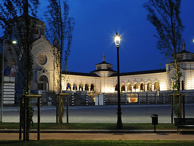 El Cimitero Monumentale de Milán es considerado un gran museo al aire libre. Con ocasión de la inauguración de la nueva estación subterránea, se renovó la plaza frente al cementerio. Se eligió la farola Tabit con luminaria Light 804 para la iluminación.