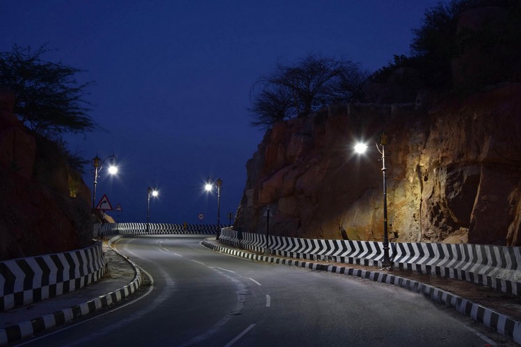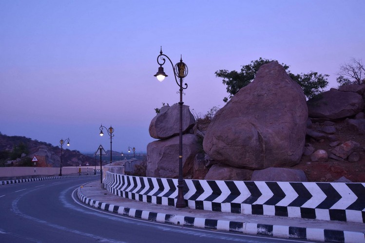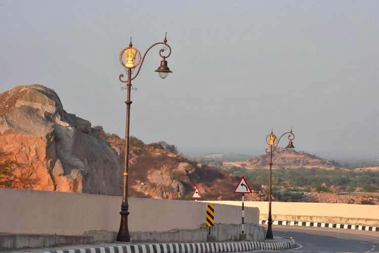 El acceso al templo está garantizado por una carretera construida especialmente que sube hasta la cima. Para iluminarla, se ha elegido el poste Tabit con un brazo de báculo personalizado que luce el escudo dorado, símbolo del templo.