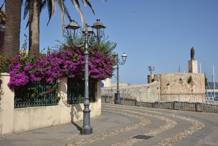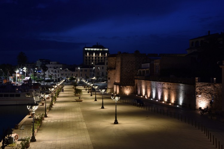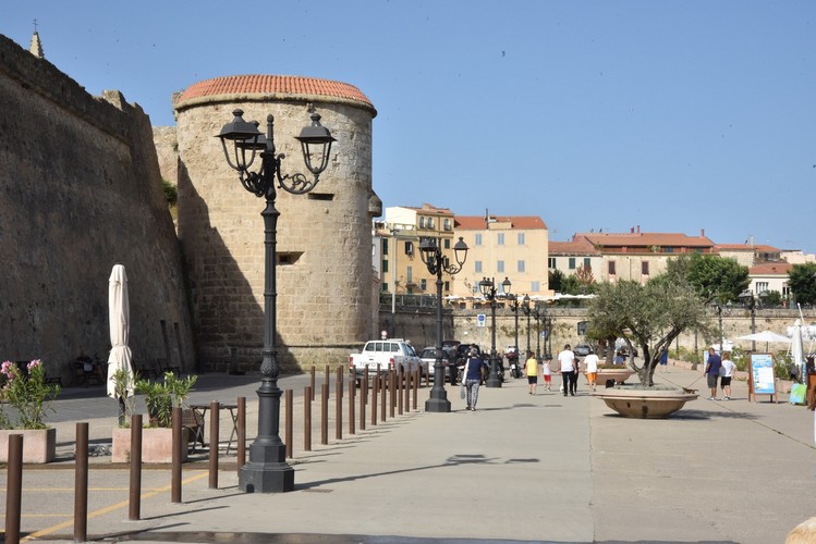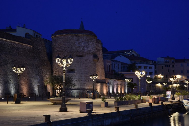 Una doble fila de farolas Sheliak con luminarias Light 804 ilumina el muelle del puerto de Alghero.Un telón de fondo escénico lo proporcionan las antiguas murallas de la ciudad. Presentación PDF