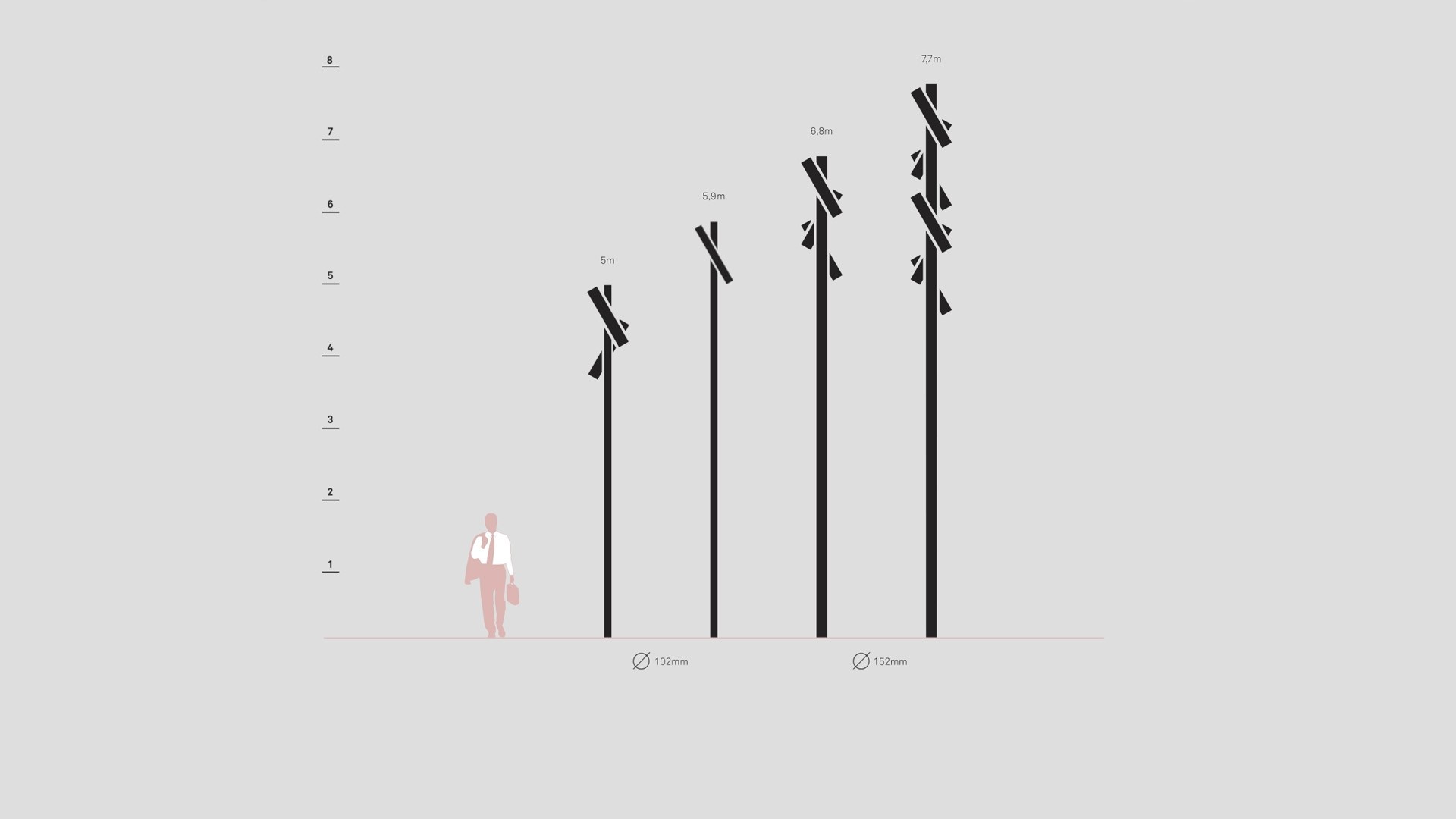 Les éléments lumineux de différentes dimensions, apportent minimalisme et modernisme aux lieux historiques et s'intègrent aussi parfaitement à l'architecture contemporaine. Trois éléments principaux : bornes pour allées, bollards lumineux et un système d'éclairage, conçus pour intégrer parfaitement toute une série d'accessoires, des porte-bannières et bacs à fleurs, aux caméras, capteurs, et diffuseurs sonores.