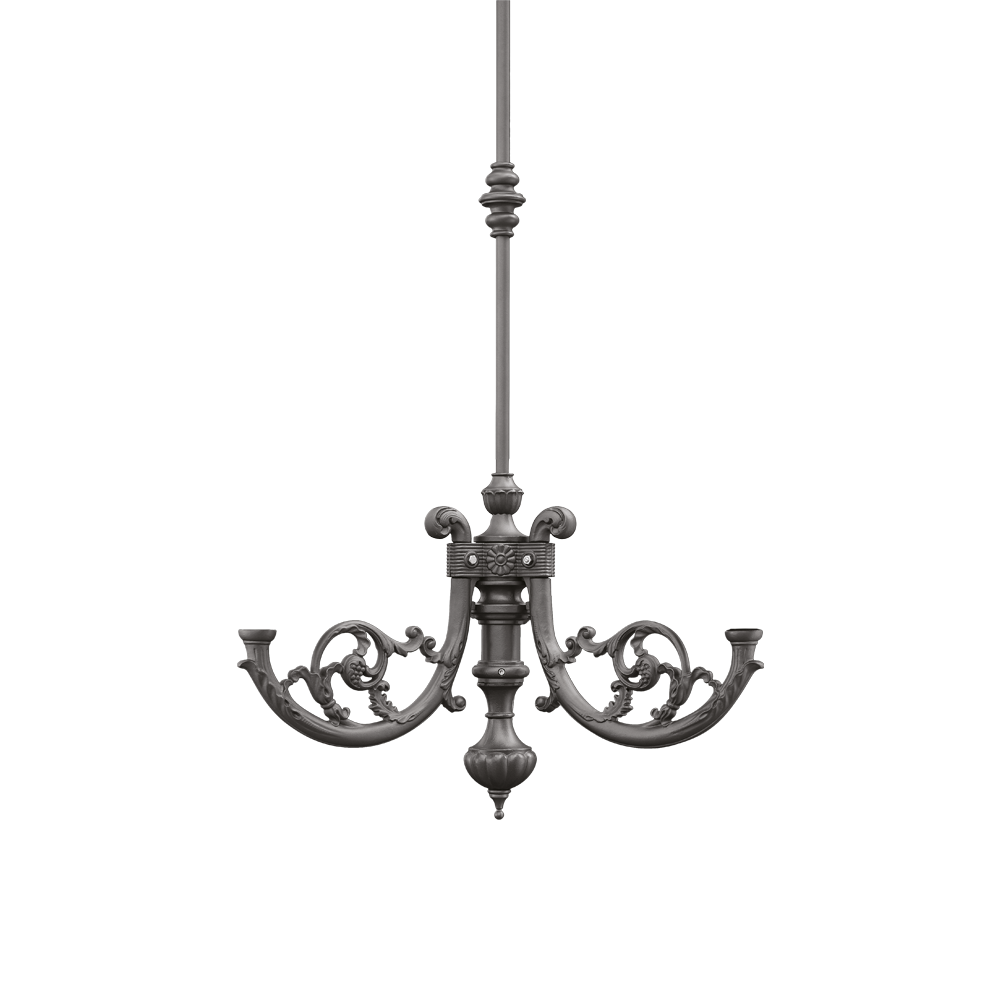 Lustre à trois lumières en fonte, aluminium et acier galvanisé à chaud, composé d'une rosace, d'un tube de support, d'un support central et de trois étagères décorées de feuilles ainsi que d'autres éléments pour compléter la structure. Supports avec raccord fileté pour la fixation de luminaires en portés.