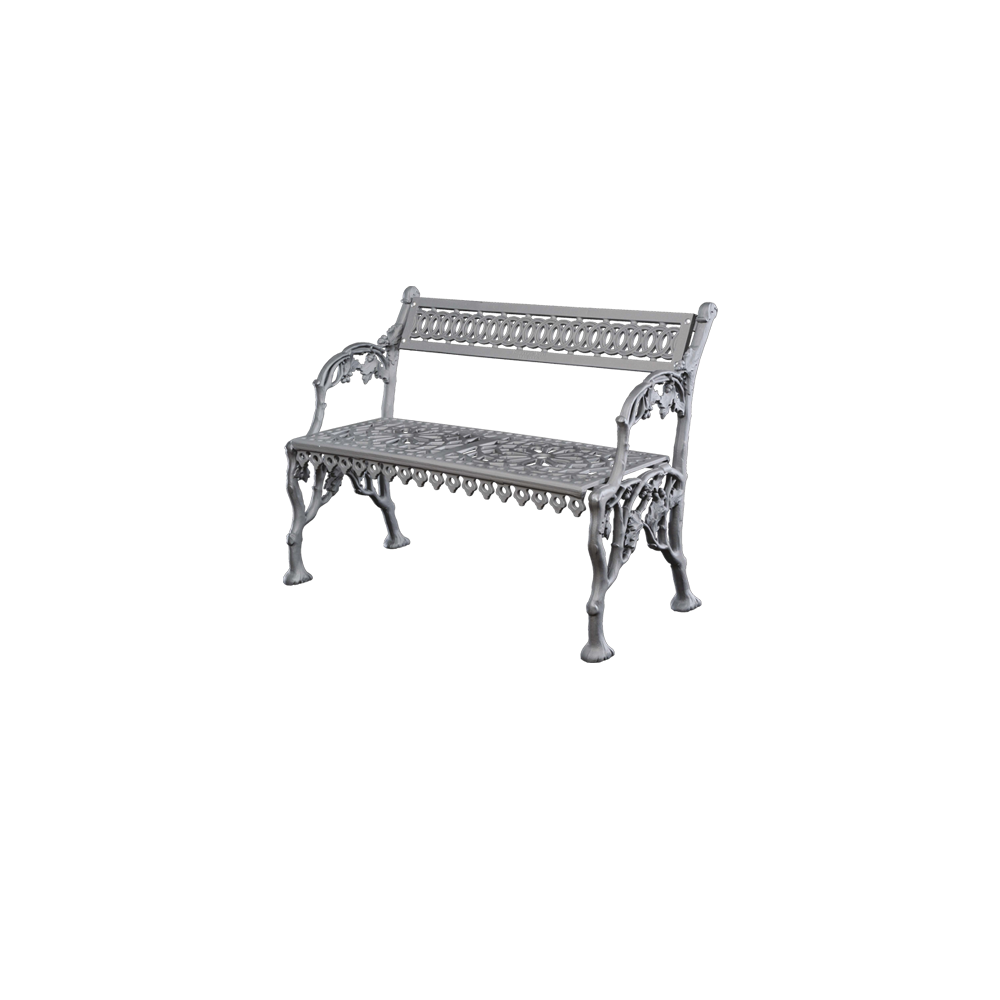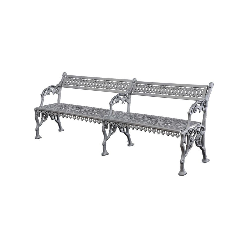 Banc avec des décorations florales et géométriques, avec accoudoirs, entièrement en fonte; assise double modulaire caractérisée par une forme linéaire.