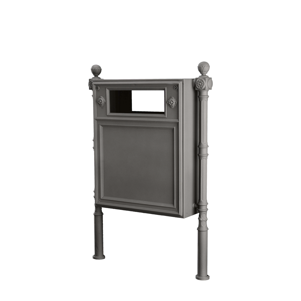 Corbeille monoface avec châssis rectangulaire en tôle d'acier galvanisé à chaud et panneau frontal ouvrant en fonte d'aluminium. Supports latéraux avec éléments décoratifs en fonte ou compartiments fermés pour armoires électriques.