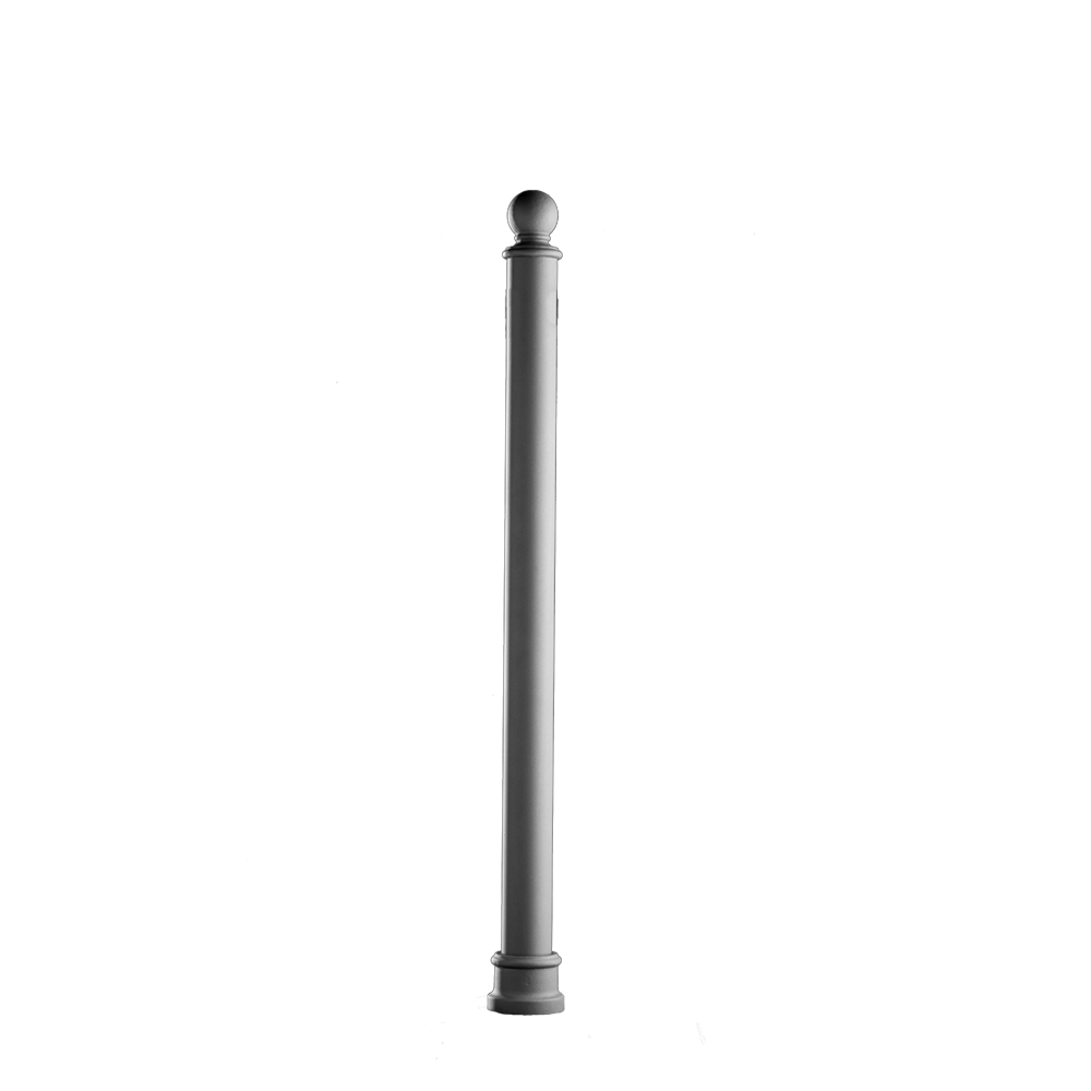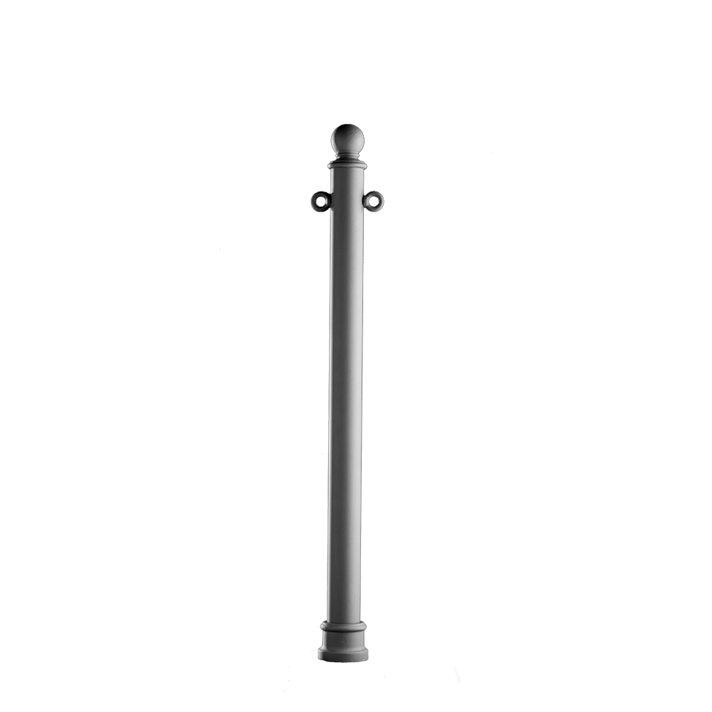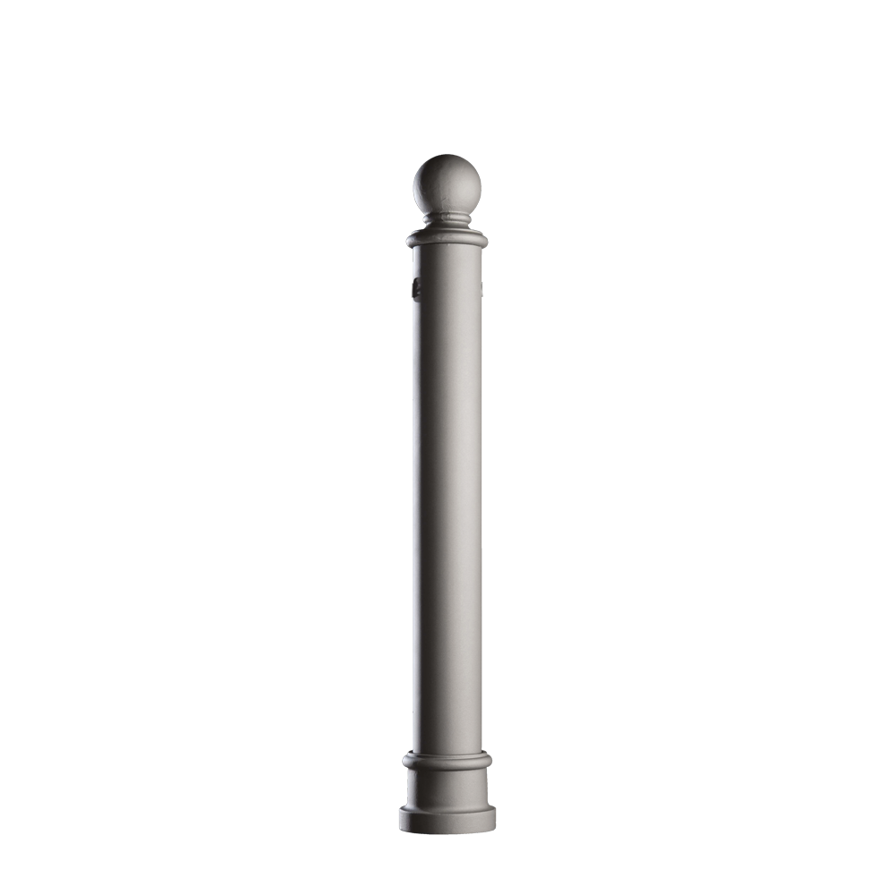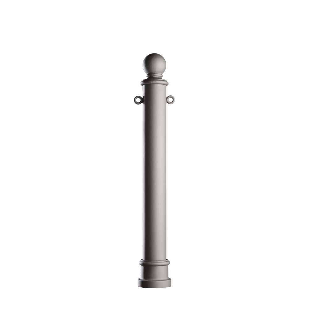 Borne en acier galvanisé à chaud, avec base et élément décoratif supérieur en fonte. Corps cylindrique muni d'anneaux pour une fixation éventuelle de la chaîne.